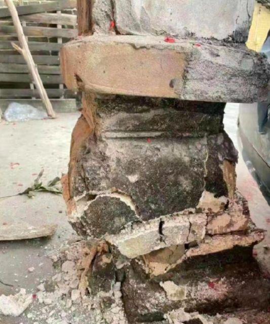 从曝光的现场来看,一辆奔驰E级轿车在倒车时,将祠堂的一个立柱撞坏,与地面的连接处几乎断开,奔驰尾部也有损伤。
